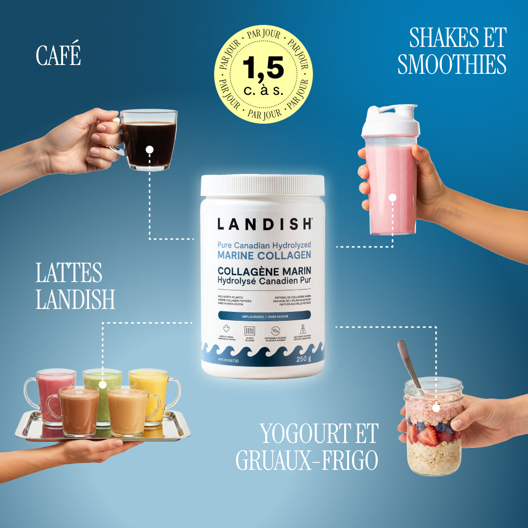 « Je suis ravie de soutenir une entreprise québécoise comme Landish. Son collagène se marie à merveille aux breuvages et n’a pas d’arrière-goût, ce qui est plutôt rare à trouver. Depuis que j’en consomme, j’ai l’impression que mon corps me remercie. Je me sens plus forte et ma peau est définitivement plus rayonnante. »