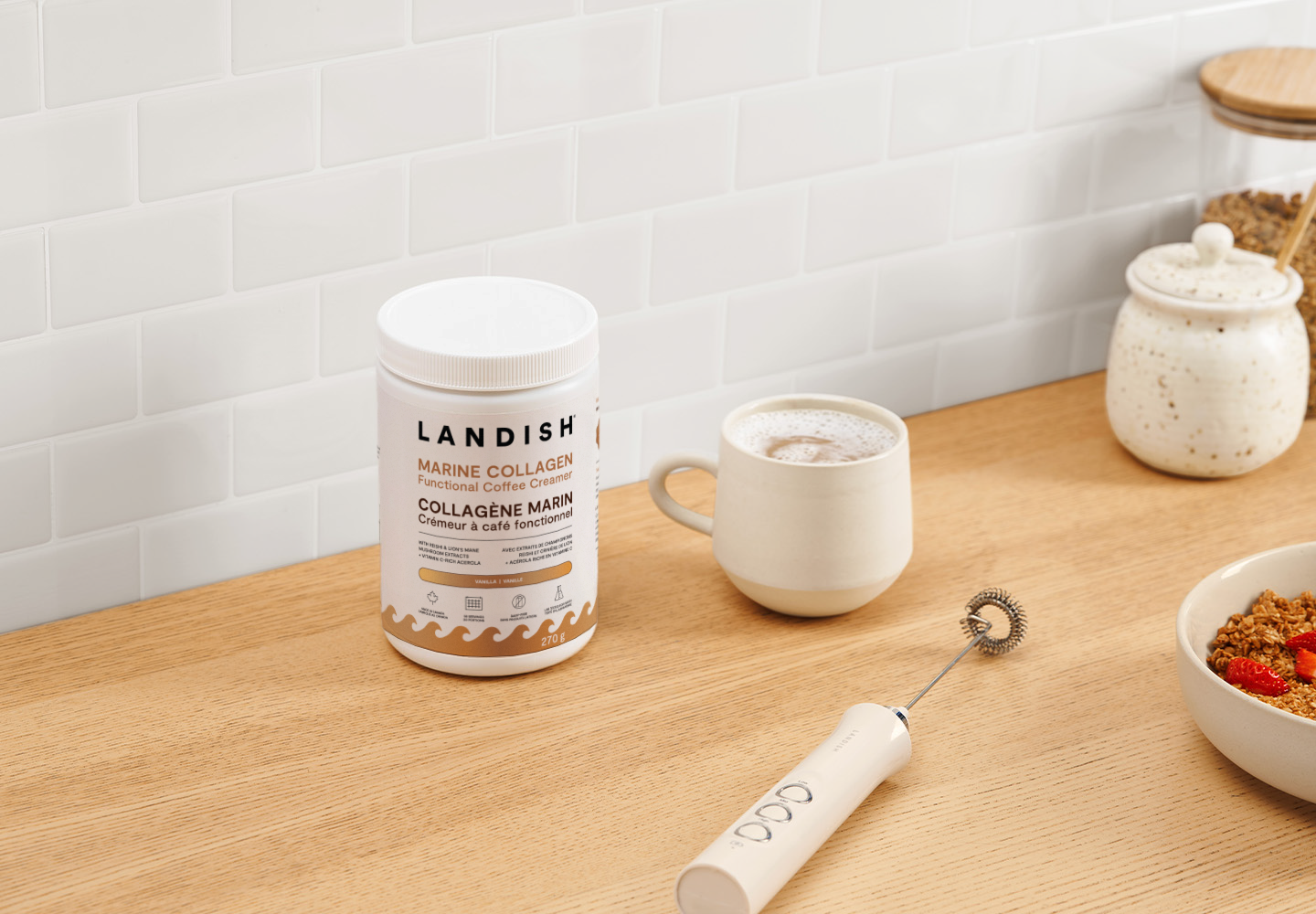« Un autre produit Landish dont je ne peux plus me passer! Ce produit a complètement révolutionné ma petite routine du matin. Depuis que je le mélange à mon yogourt grec aux fruits, j’ai l’impression que mes articulations sont plus souples et ma peau moins sèche. Le collagène marin et les champignons médicinaux y sont certainement pour quelque chose. »